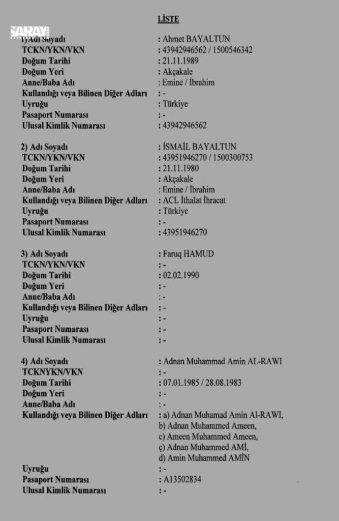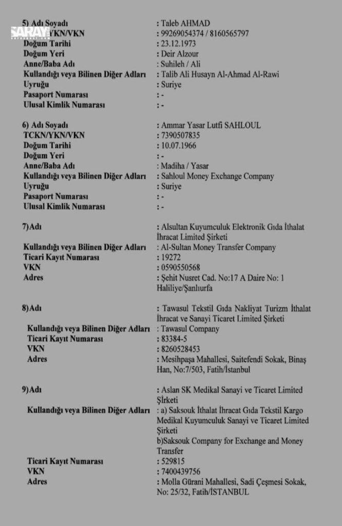 والأفراد الذين جُمّدت أموالهم، وفقًا للقرار، هم أحمد بايلتون وإسماعيل بايلتون (جنسية تركية)، وفاروق حمود وعدنان محمد أمين الراوي (لم تُوضح جنسيتهما)، وطالب أحمد (جنسية سورية)، وعمار ياسر لطفي المعروف بـ”شركة سحلول للحوالات المالية” (جنسية سورية).
