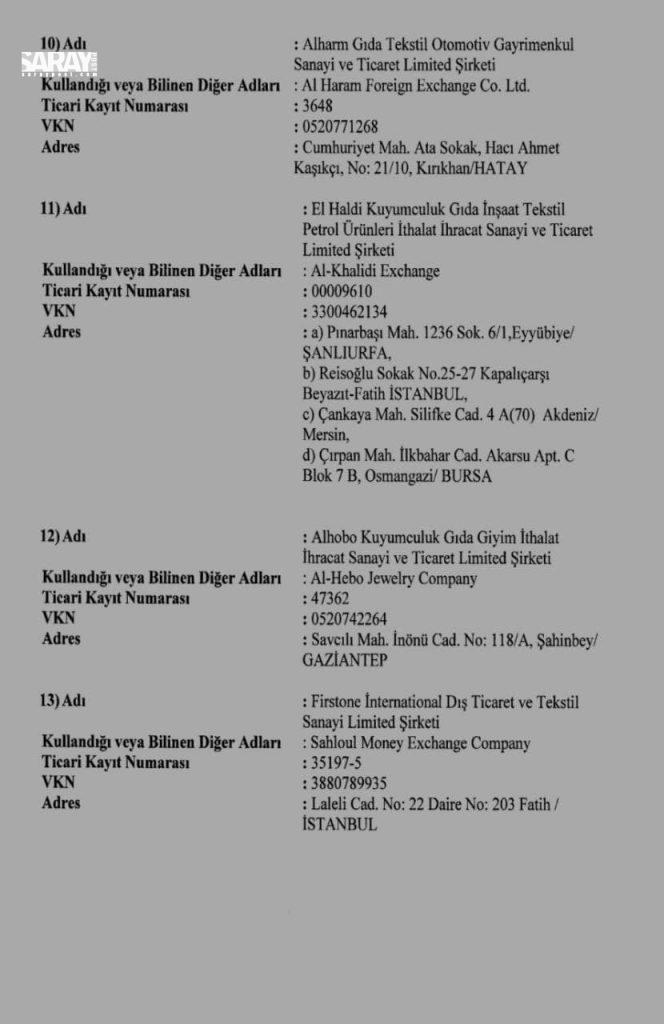 والشركات هي: “مجوهرات السلطان” ومقرها ولاية شانلي أورفا جنوبي البلاد، و”توسل” و”سكسوك” للحوالات المالية، و”سحلول” للحوالات المالية ومقرها منطقة الفاتح في ولاية اسطنبول.